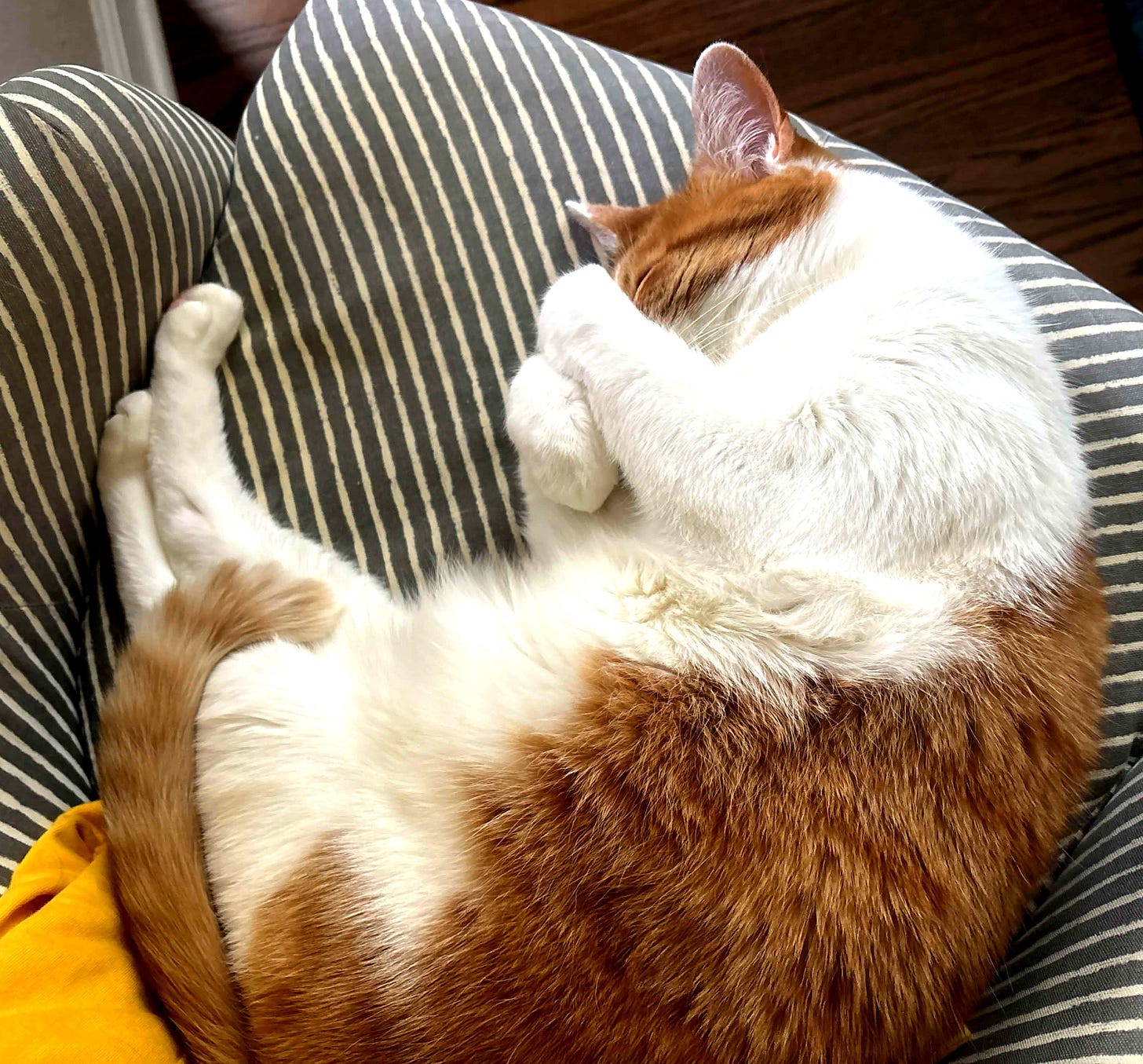 As a present for your companionship, dear reader, please enjoy the above photograph of my peetyboy Jupiter, our sweet orange who will YOWL LIKE THE DICKENS if he cannot lay up on that sofa and rest with the tournament on the set.